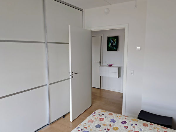 Fra soveværelset ser man ud mod entréen og kan se døren til toilet og bad.